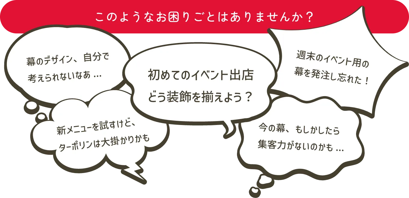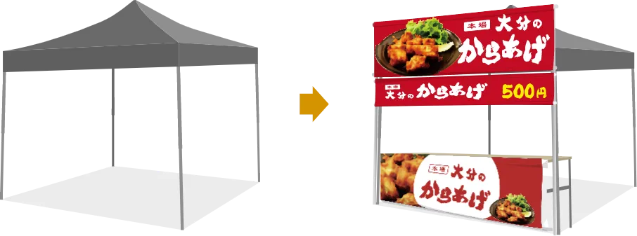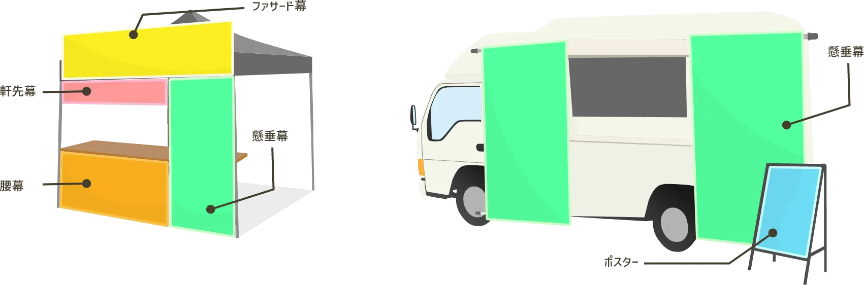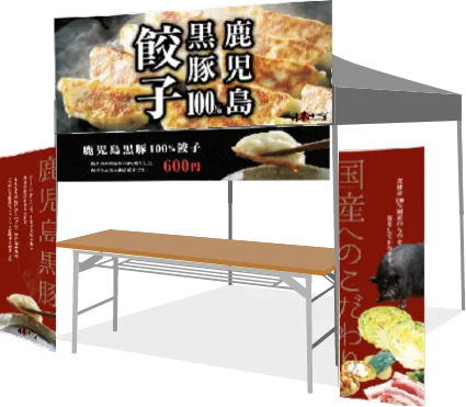 幕プロの「幕」は単なる飾りではなく、集客ツールとして人の目線を引きつけます。キッチンカー、テントでの出店に効果絶大でリピート率は90%!!売りたい商品名と、写真で簡単にオリジナルの幕を作成します。お急ぎなら短納期での納品も受付ます。